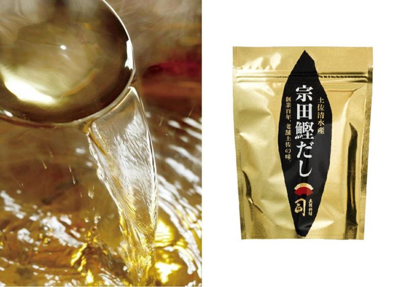 濃厚なうま味と香りから、プロの料理人たちからも選ばれる高知県土佐清水市特産の宗田節。高温で一瞬に焼き上げて高圧でプレスする「瞬間高温高圧焼成加工」により、風味を閉じ込めました。北海道産昆布、椎茸、少量の海塩と醤油を調合し、味に深みをプラスしています。