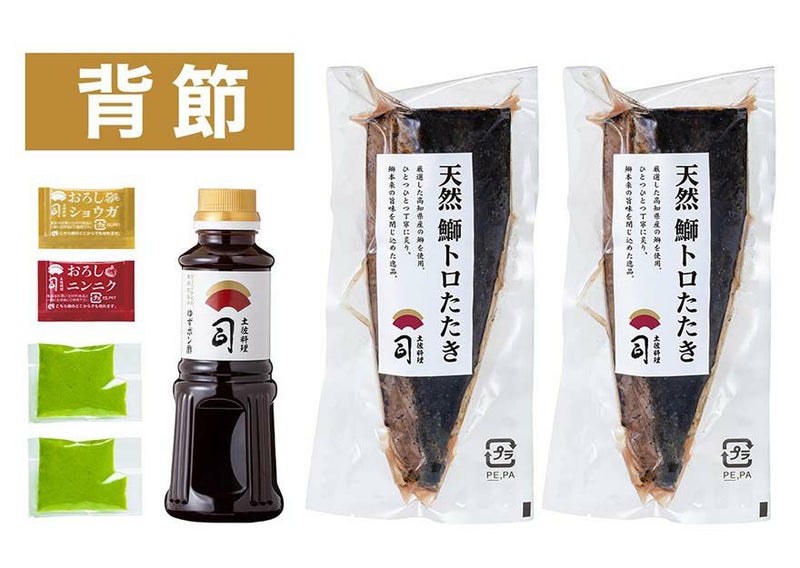 名物一本釣り鰹のたたきと鰤トロたたきを一緒に楽しめる、贅沢なセットを数量限定でご用意しました。どちらも解凍して、切るだけでご家庭で極上の味わいをお楽しみいただけます。