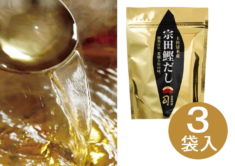 濃厚なうま味と香りから、プロの料理人たちからも選ばれる高知県土佐清水市特産の宗田節。高温で一瞬に焼き上げて高圧でプレスする「瞬間高温高圧焼成加工」により、風味を閉じ込めました。北海道産昆布、椎茸、少量の海塩と醤油を調合し、味に深みをプラスしています。