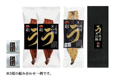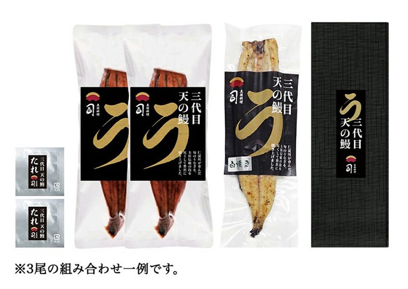 ・三代目 天の鰻 蒲焼き(1尾 130g)または 三代目 天の鰻 白焼き(1尾 130g) 3尾の組み合わせをお選びいただけます。 ・三代目 天の鰻 たれ【20cc×1袋】(蒲焼)
